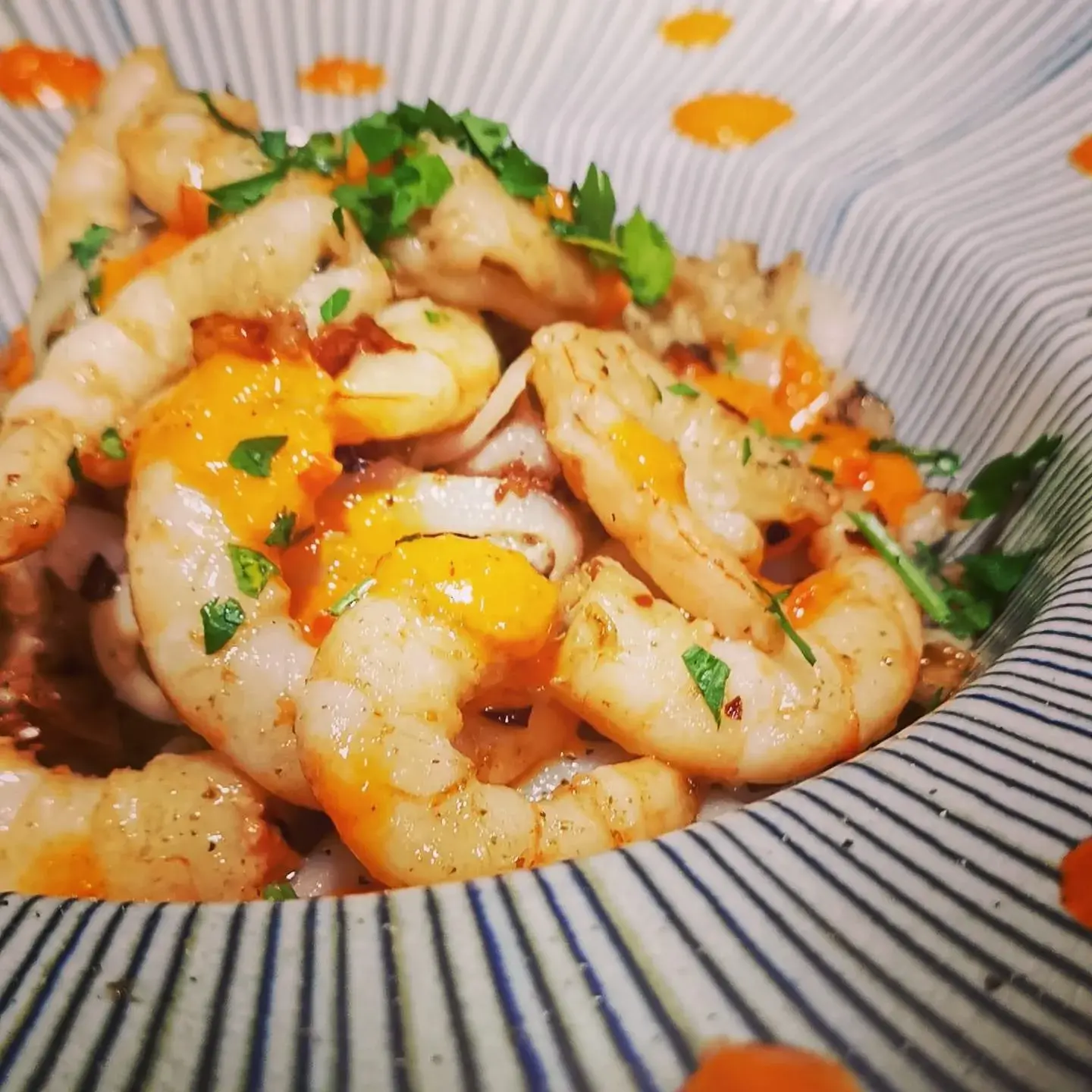 Nuestros famosos espaguetis de calamar, finas tiras de calamar salteadas con ajo guindilla y gambas